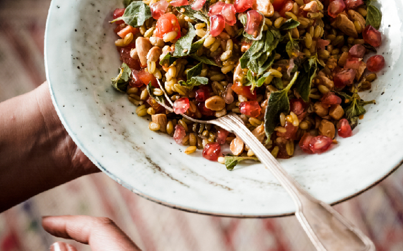 Stap 5: Meng vlak voor het serveren driekwart van de granaatappelpitten, de gehakte amandelen en driekwart van de oreganoblaadjes door de freekeh. Breng op smaak met de olijfolie en wat peper en eventueel wat extra zout. Serveer op een mooie schaal. Bestrooi met de rest van de granaatappelpitten en oregano. Het is ook lekker wat granaatappelmelasse en/of citroensap door de freekeh te scheppen voor een friszure bite.